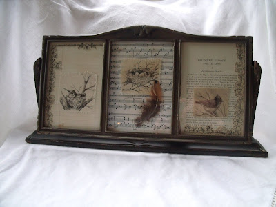 We continued the birthday fun at breakfast this morning with my Aunt Kathy(mom's sister)--who just happens to share the same birthday. She was born on my mom's third bithday. I try each year to make my mom's gift. She always says not to buy her anything so I try to find something unique to create for her. This year I knew as soon as I saw the beautiful art of Michelle Palmer that I had found the perfect thing. Mom loves birds so I purchased three pen and ink sketches from Michelle, made them mats of vintage sheet music, notebook paper and a page from a French book and framed them in a vintage frame.